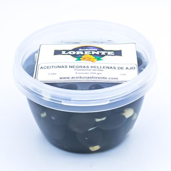 Black olives stuffed with garlic. Pitted black Cacerean olives (from Plasencia, Cáceres) stuffed with crunchy garlic, with a delicious flavor ideal for appetizers, salads and other accompaniments.