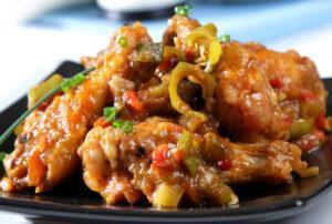 Pollo con salsa y guarnición de jalapeños