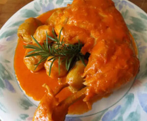 Pollo al whisky guisado con alcachofas y salsa de pimiento