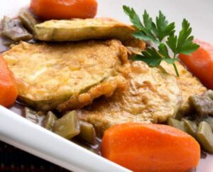 Berenjenas, cebolletas, zanahoria, judías verdes, huevos, harina, vino tinto, aceite de oliva virgen, perejil, orégano, agua y sal.
