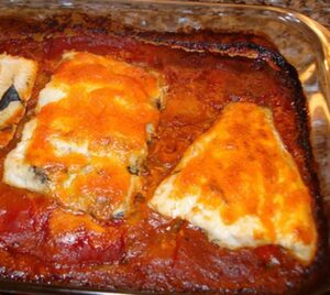 Lomos de bacalao desalado, tomates, mantequilla, nata de cocinar, perejil, coñac, aceite, agua y sal.