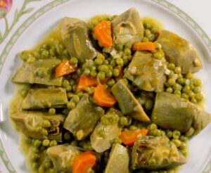 Ingredientes: Alcachofas, cebolleta, zanahorias, guisantes, ajo, harina, aceite de oliva, vino blanco, agua, sal.