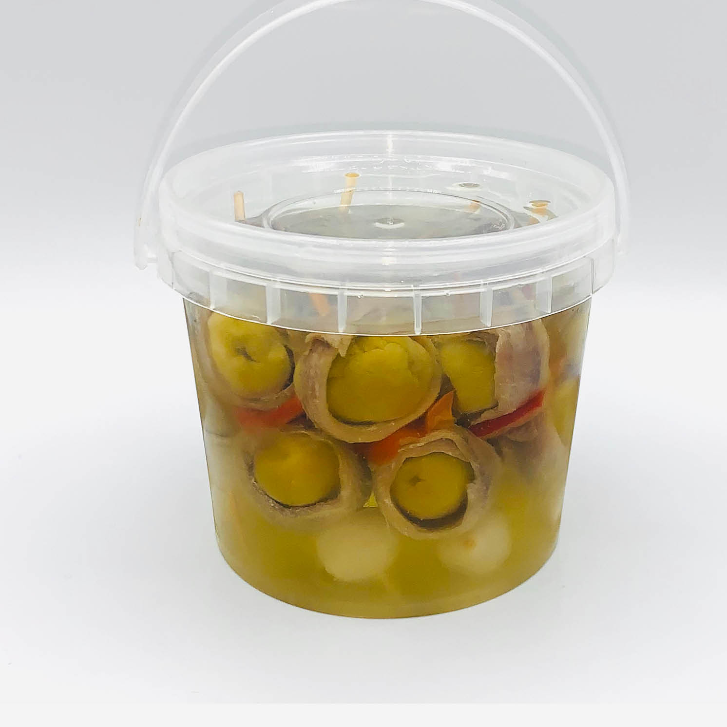 Простота сделана качеством. Вкусные в зигзаге анчоусы в сопровождений оливок, заполненные тунцом высшего качества и маринованным красным перцем.